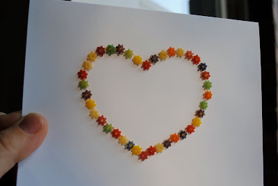 Draw a heart on your blank piece of paper. Start glueing your pasta over the line. Use the markers to color the pasta.