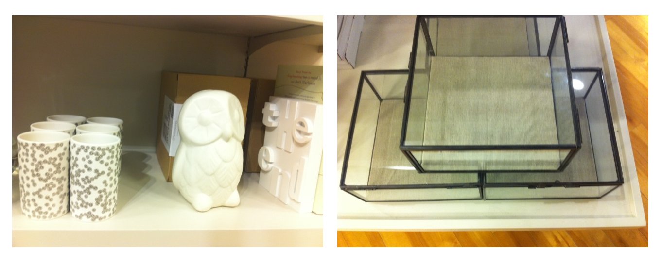 Here are some more items. Sorry for the pictures, but the iphone was my only companion on this trip. I also love the lettered bookend and these 3D glass boxes are fabulous to display some season items, may it be leaves, rocks, seashells. Perfect for your coffee table, bookcase or even a console table. These golden pencil cup holders are so beautiful. Love that super cute owl. Have I mentioned that my little munchkin can hoo hoo like an owl? So cute.