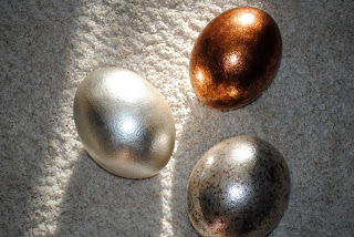 I think they are beautiful. And you can make your own gorgeous gold and silver eggs. The eggs in the picture are ostrich eggs, but you can use regular eggs as well.