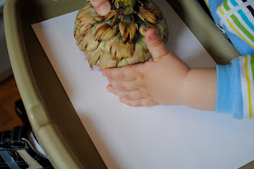 To make your own, you will need the following: blank card or cardstock, ink pad, stamps (if you want), and....the key ingredient....an artichoke.