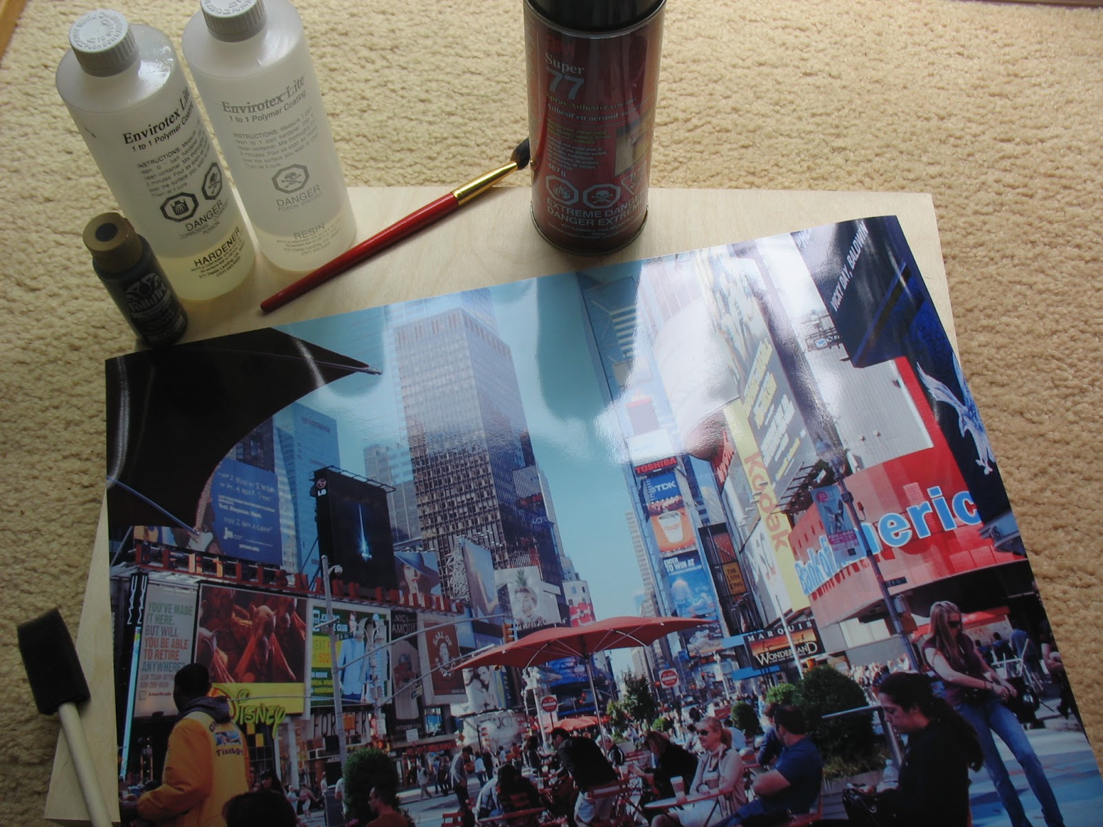 - wood panel canvas - (whatever size you want), spray glue, varnish, brush, paint, big cardboard, drop sheet