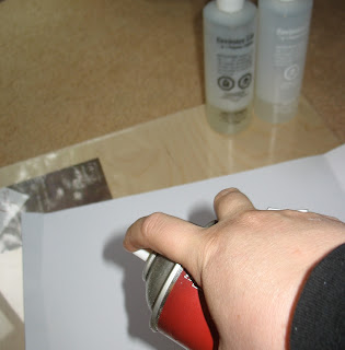 3. Use your spray glue and spray on the back of your picture. Make sure you keep the can away from the picture (at least 2 ft, otherwise the picture gets wet).