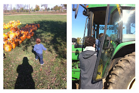 Last Saturday, we headed to a pumpkin patch, where my little munchkin enjoyed a hay ride and didn't want to get off. He also got a chance to ride in the tractor. He was speechless. Best experience ever. I think that made his weekend, week, month. So cute. He was so happy.
